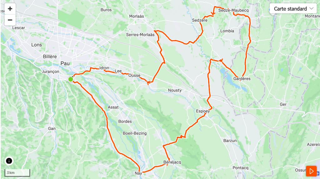 Sortie 60 sens inverse : Mazeres, Nay, Lagos, Espoey, Lourenties, Garderes, Bédeille,